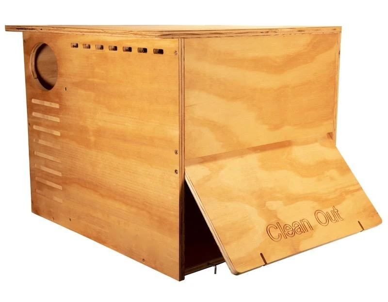 Sturdy owl house not only meets- but exceeds the needs of the Barn Owl. Entrance hole is elliptical, with inner compartments to thwart competitive great horned owls and furry predator’s like raccoons too. End door makes for quick and easy clean-out. Exterior has been treated with natural linseed oil to preserve wood.