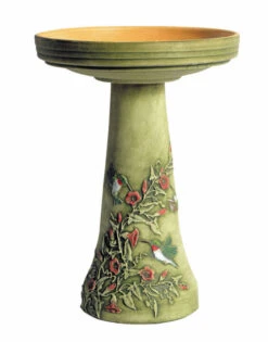 Vinyl Art Pole features warm, earthy tones of reproduced hand painted artwork, it’s laminated for fade resistance, durable and maintenance-free. Ideal for year-round use, the Sentimental Journey Bird Bath accommodates a bath heater in winter, and it’s the perfect size for adding a dripper, solar fountain or water wiggler in summer to keep water moving.